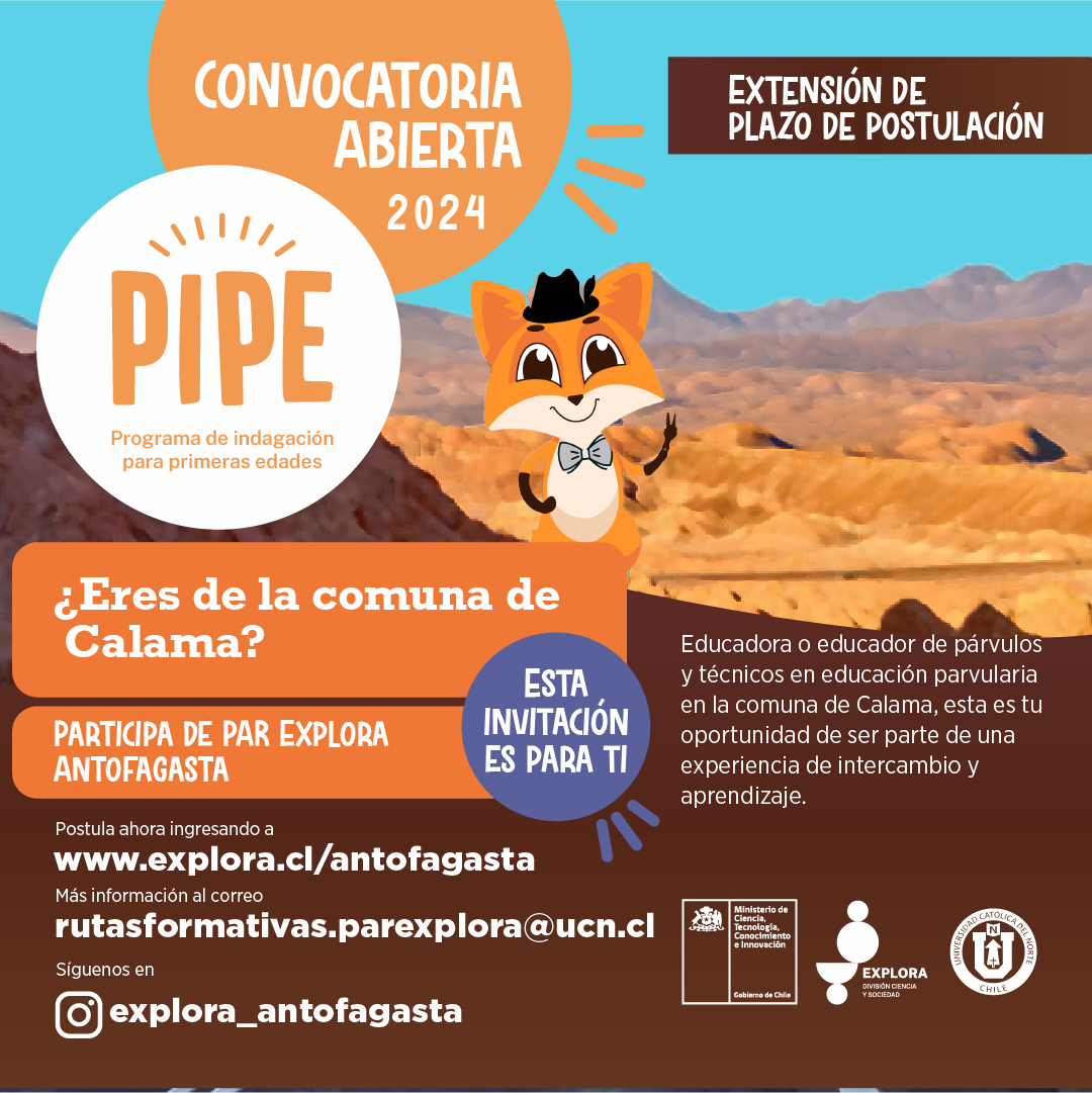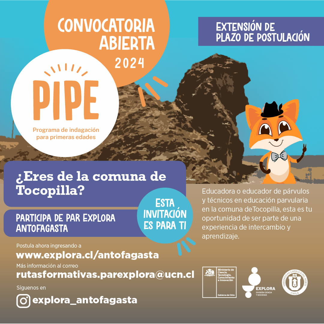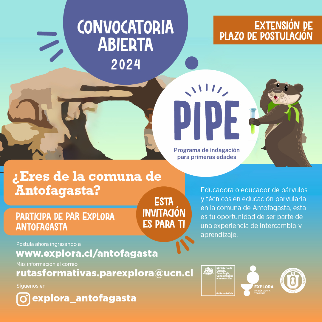 Durante el mes de abril, Educadoras/es y Técnicos/as en Educación Parvularia de la Región de Antofagasta tienen la oportunidad de postular al Programa de Indagación para Primeras Edades (PIPE 2024). Esta iniciativa, liderada por el Proyecto Explora Antofagasta del Ministerio de Ciencia, Tecnología, Conocimiento e Innovación y ejecutada por la Universidad Católica del Norte (UCN), busca impulsar la innovación en las aulas mediante la integración de la ciencia, la innovación y la tecnología.