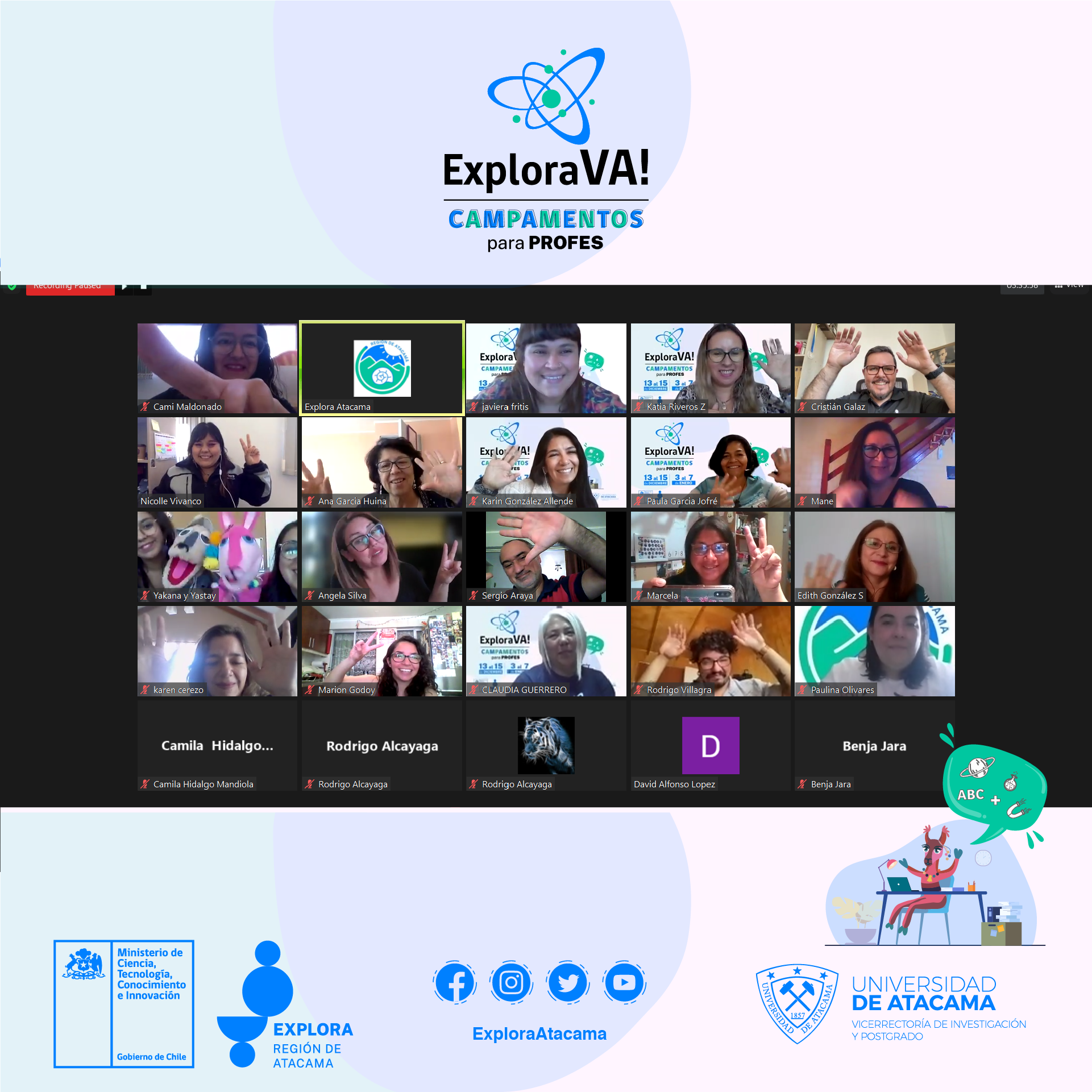 Una salida a terreno al Humedal del Río Copiapó, actividades de reflexión, relatorías con expertos, creación de redes de colaboración entre sus participantes y obtención de nuevas herramientas son parte de las experiencias que marcaron quienes fueron parte del Campamento de Ciencia para Profes Explora Va! que en 8 sesiones online y un encuentro presencial logró unir a 25 asistentes voluntarios de las provincias de Copiapó y el Huasco.