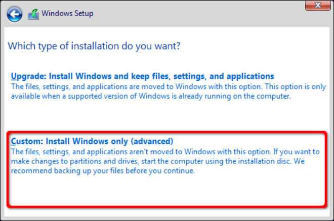 Después de eso, seleccione "Personalizado: Instalar solo Windows" en la siguiente ventana. Esto no es una mejora dado que estás empezando desde cero.