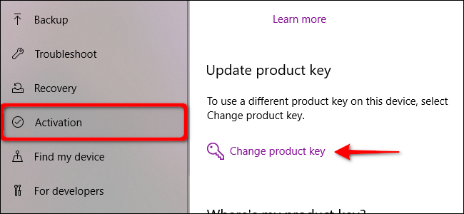 Seleccione "Activación" que aparece en el menú de la izquierda y luego haga clic en el enlace "Cambiar clave de producto" en la mejor lista debajo del encabezado "Actualizar clave de producto".