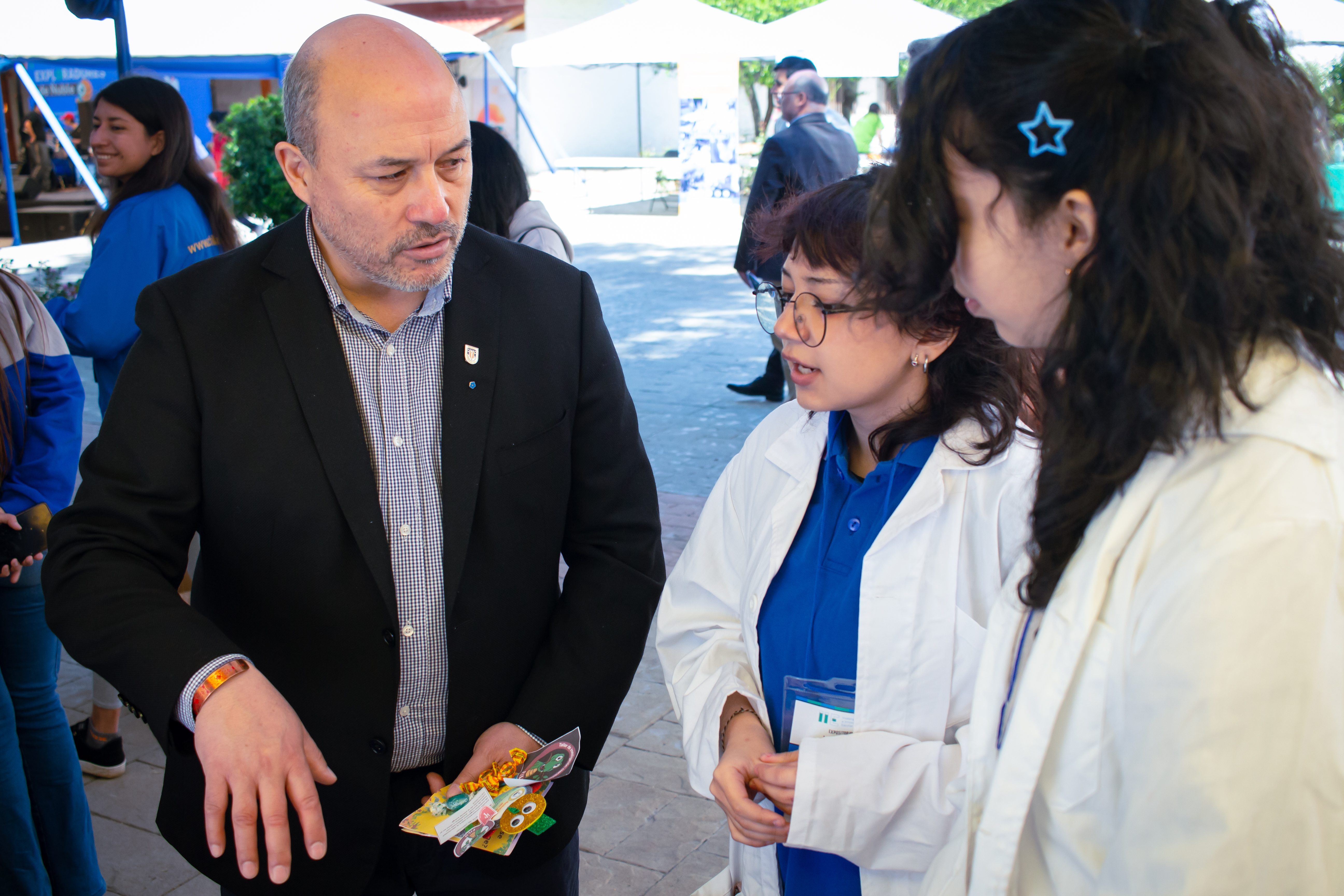 Niñas del Liceo Narciso Tondreau comparten sus resultados de investigación al Director General del Campus Chillán, UdeC, Pedro Rojas García.