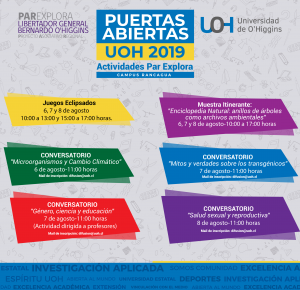 Este 6, 7 y 8 de agosto se abren las puertas de la Universidad de O’Higgins, Campus Rancagua, a estudiantes y profesores de distintos niveles para que puedan participar de diversas actividades, entre las que se encuentran las diseñadas por el PAR Explora O’Higgins, asociadas a temáticas científicas y/o de desarrollo tecnológico.