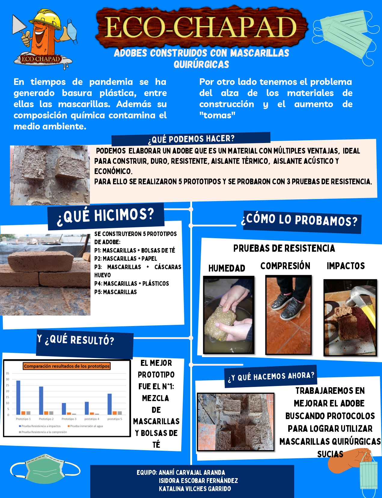 Ellas lograron identificar como problema la gran cantidad de basura que se ha generado producto de la pandemia, en gran parte por los cubrebocas desechables, además del alza en materiales de construcción y el aumento de las tomas. “Eco-Chapad” es el nombre del prototipo compuesto por una mezcla de mascarillas y bolsas de té que pasó con éxito tres pruebas de durabilidad: humedad, compresión e impactos.