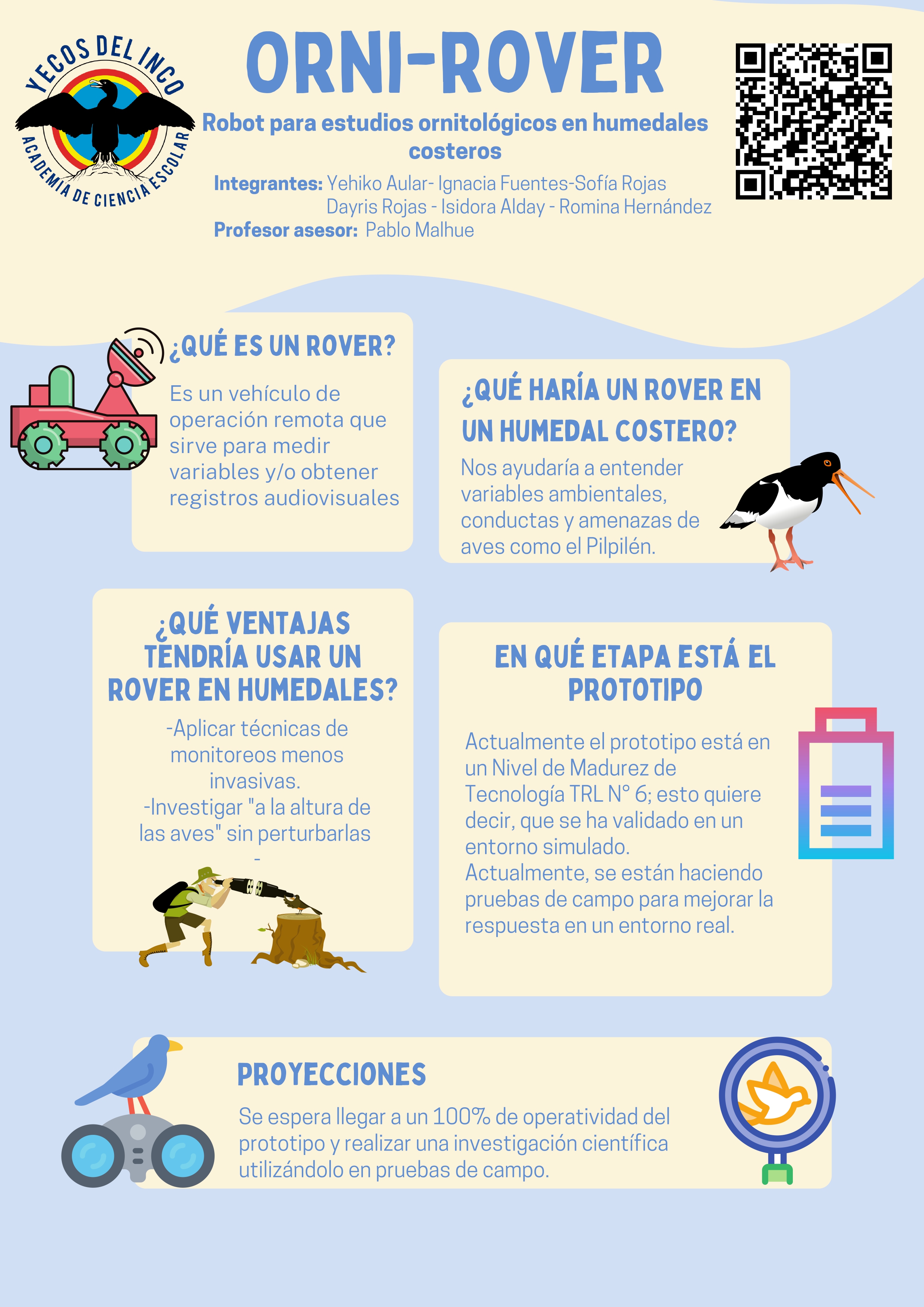 Mientras que la otra investigación destacada, corresponde a estudiantes de Educación Media de la Academia “Yecos del Inco”, pertenecientes al Instituto Comercial Marítimo Pacífico Sur de la comuna de San Antonio. Yehiko Aular, Ignacia Fuentes, Sofía Rojas, Dayris Rojas, Isidora Alday y Romina Hernández son el grupo de escolares que desarrollaron un robot para estudios ornitológicos en humedales costeros, junto a su profesor asesor Pablo Malhue Campusano.