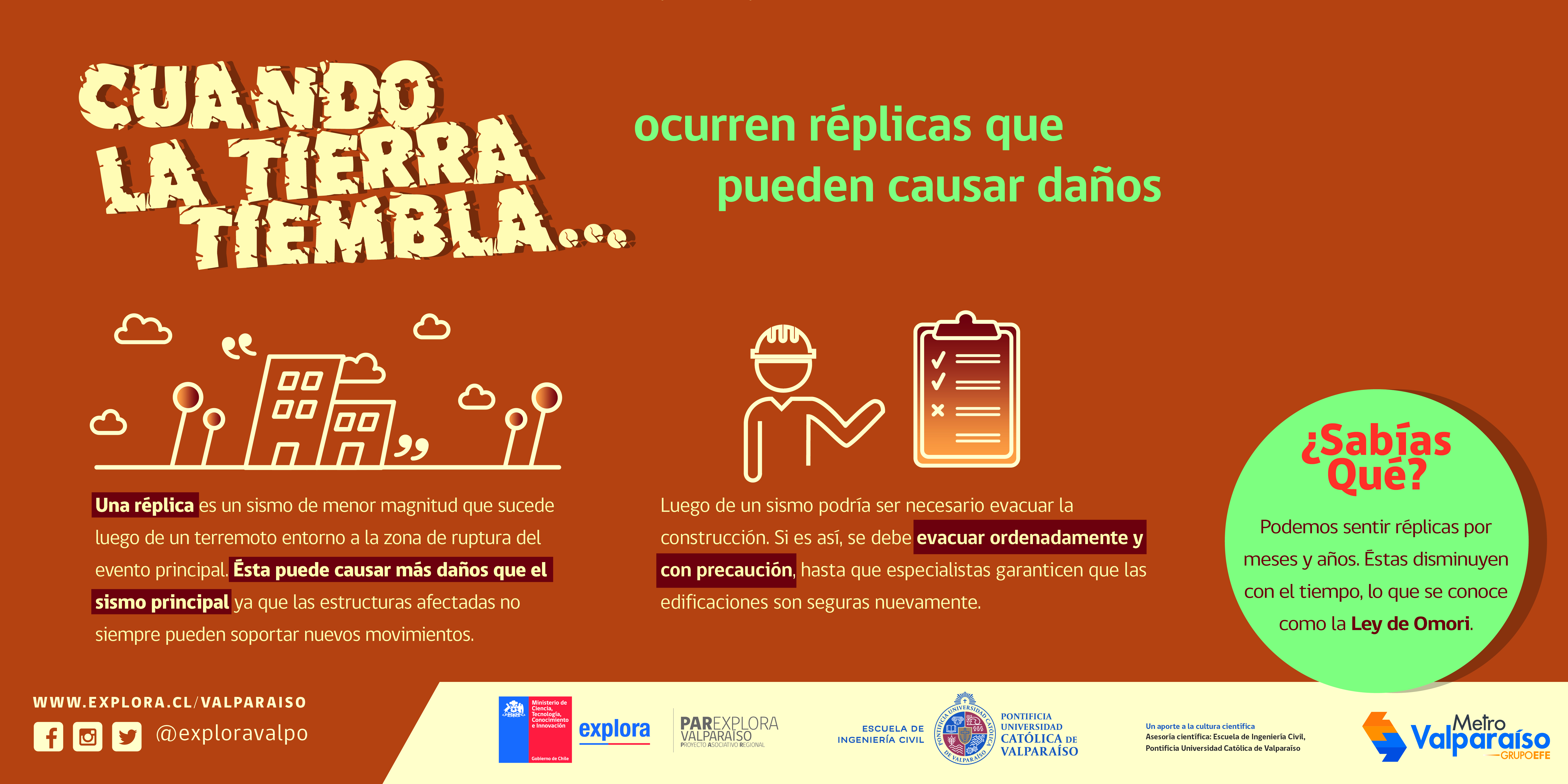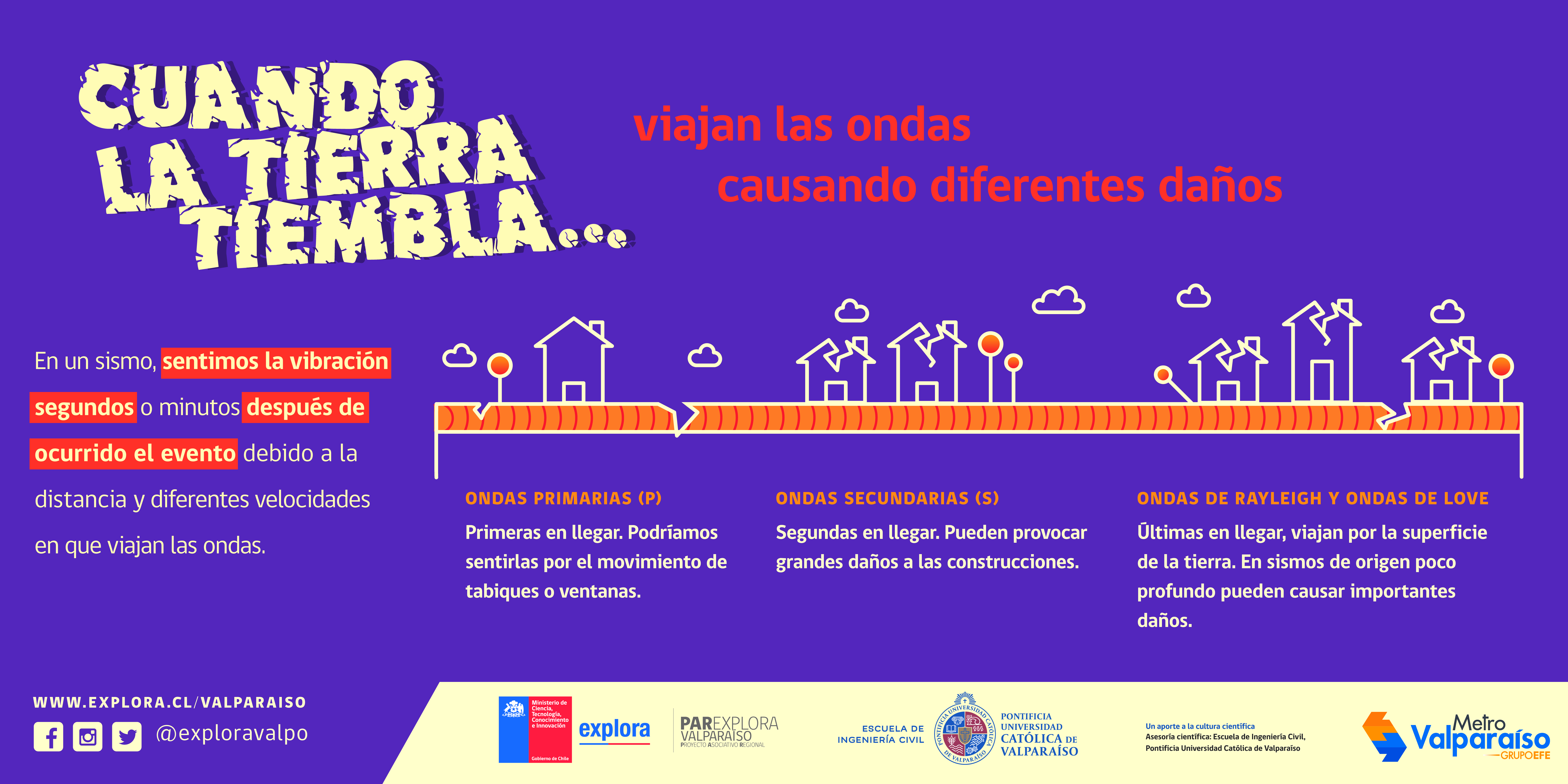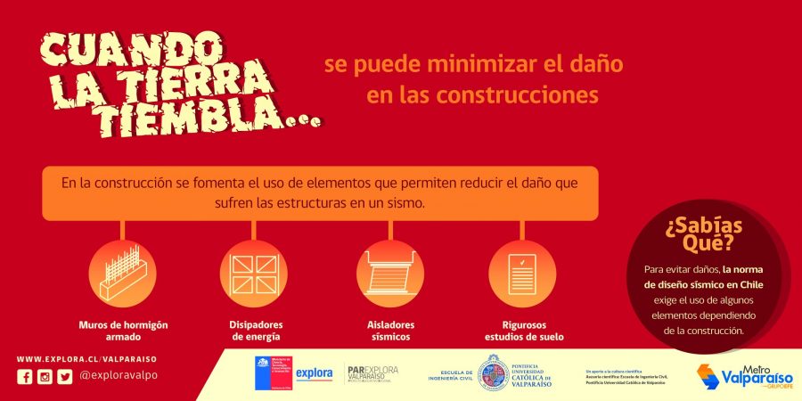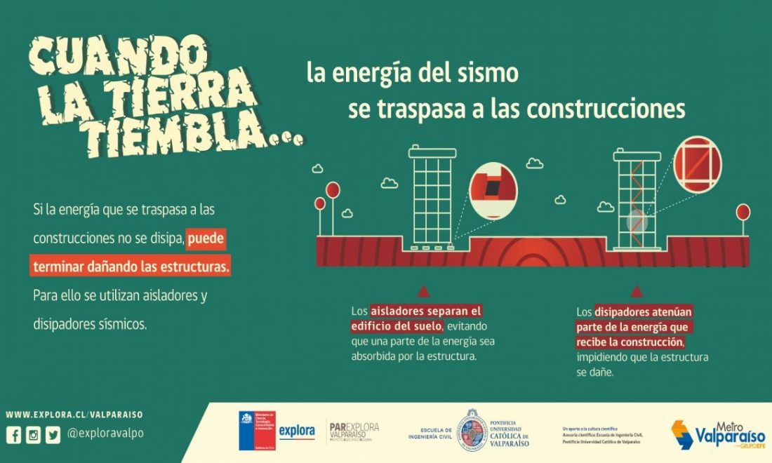 Con el objetivo de contribuir a la cultura sísmica de la ciudadanía y explicar en lenguaje sencillo y cercano aquellos fenómenos científicos que existen detrás de estos movimientos, es que Explora Valparaíso y la Escuela de Ingeniería Civil de la Pontificia Universidad Católica de Valparaíso (PUCV) lanzan la campaña “Cuando la tierra tiembla…” serie de ocho coloridas gráficas sobre distintos temas relacionados a la ingeniería sísmica y otras disciplinas.