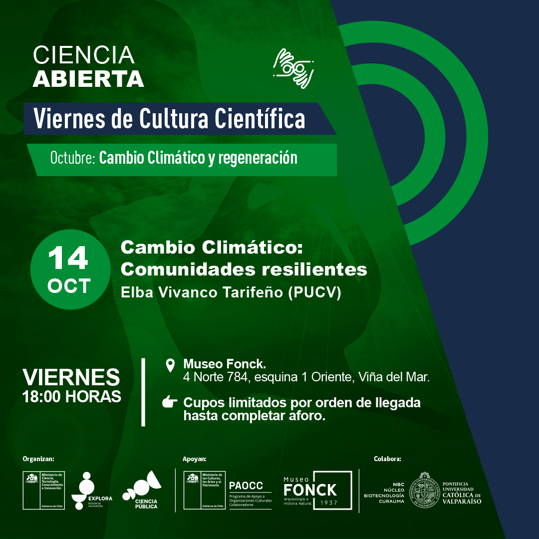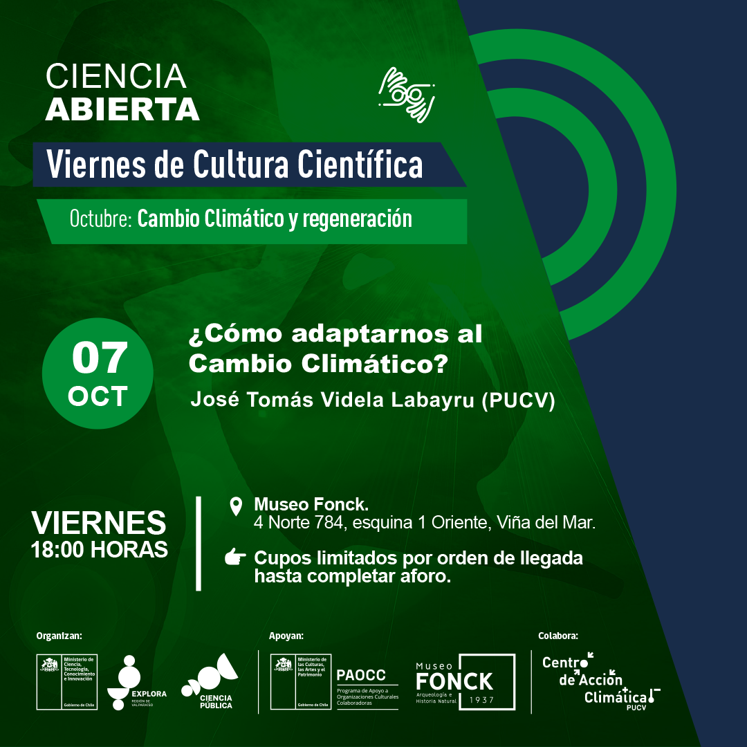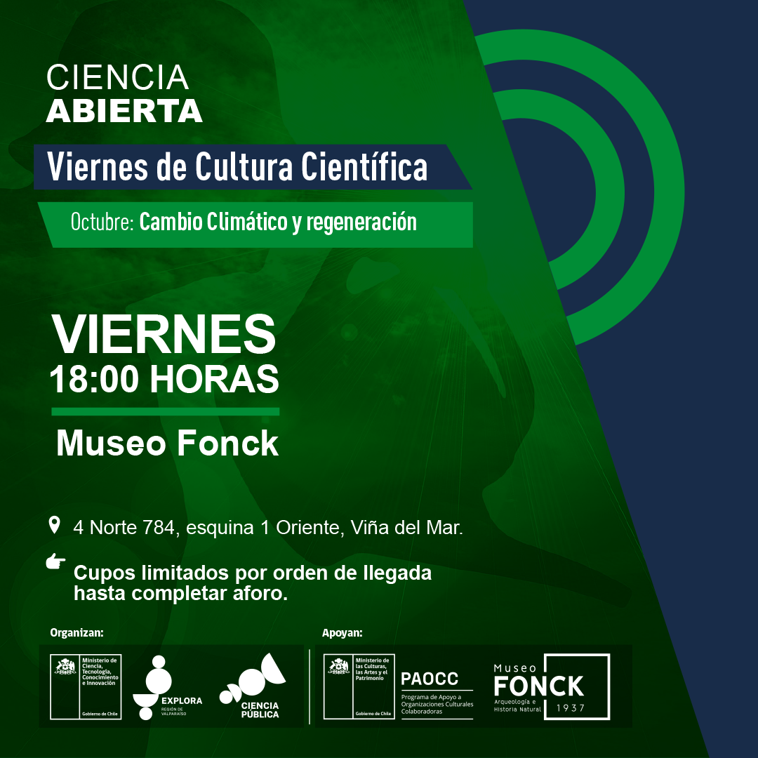 Te invitamos a asistir al Museo Fonck los viernes 7,14 y 21 desde las 18:00 horas para encontrarnos en un nuevo ciclo de charlas de Viernes de Cultura Científica, las que tratarán sobre diversas investigaciones para adaptarnos a la crisis climática existente.