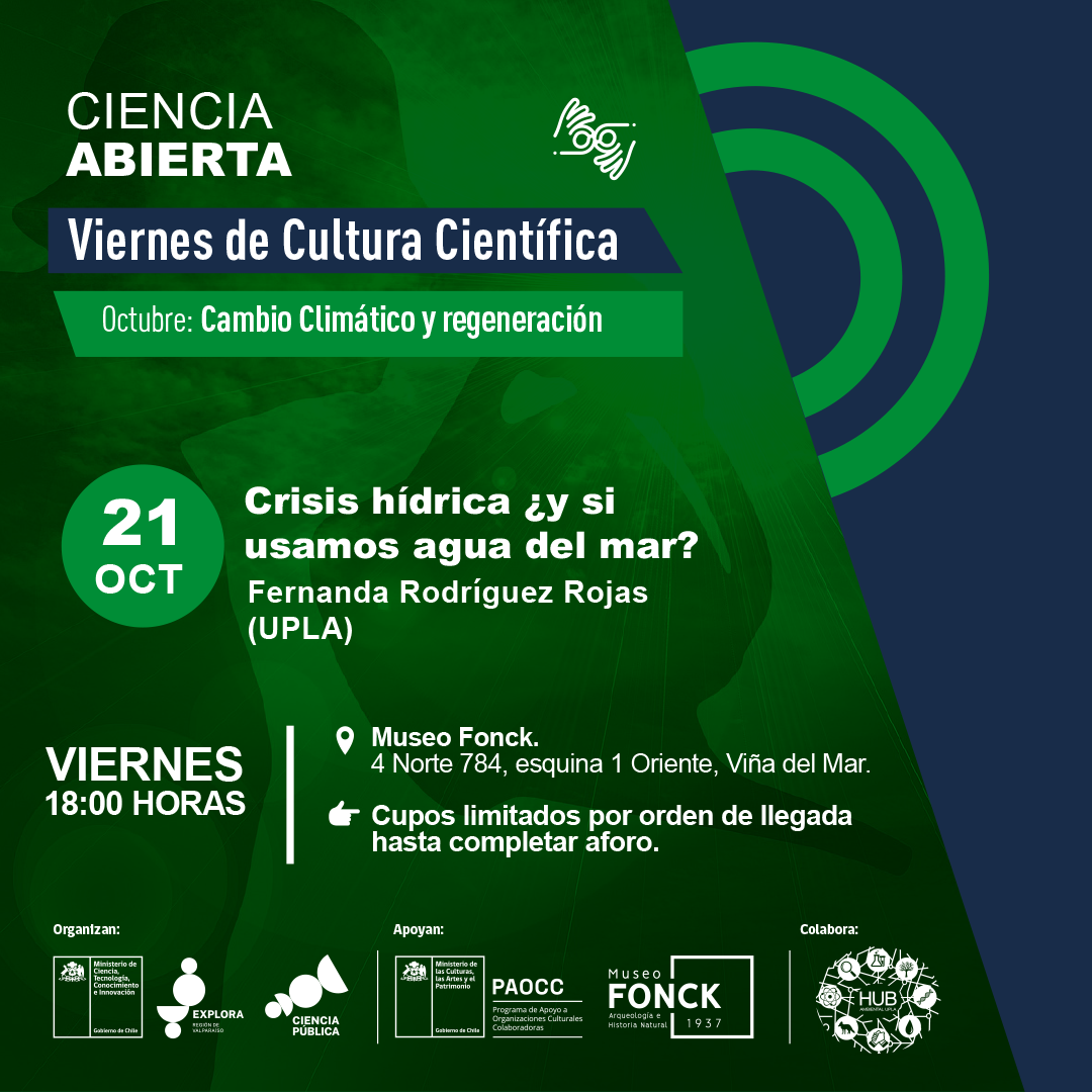 Y finalizamos el viernes 21 con una exposición donde revisaremos los pro y contra de una solución ampliamente pensada para la escasez de agua en “Crisis hídrica: ¿y si usamos agua del mar?” junto a la investigadora de la UPLA, Fernanda Rodríguez quien también es miembro del Hub Medioambiental de la misma casa de estudios.