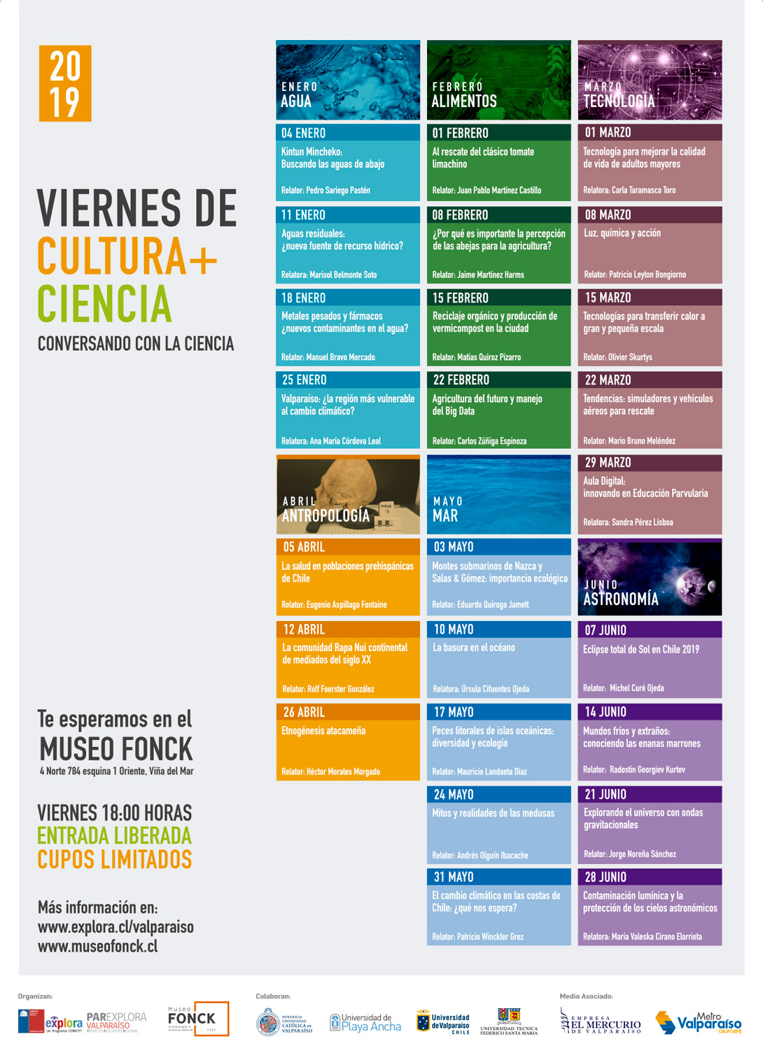 ¡Únete a la conversación con la ciencia! El PAR Explora de CONICYT Valparaíso y el Museo Fonck ya lanzaron la programación del primer semestre del Viernes de Cultura + Ciencia 2019, el espacio de encuentro con especialistas de todos los viernes.