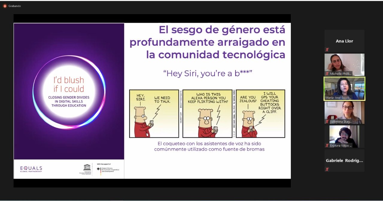 “Hoy me gustaría escuchar sus preguntas e inquietudes y a que pensemos acerca de porqué es necesario hablar sobre igualdad de género. Acerca de igualdad de derecho y de oportunidades y de violencia simbólica. El dato que entregó María José de que la mayoría de las asistentes virtuales (Siri, Alexa o Sam) tienen voces femeninas y de que hay una fuerte tendencia de los desarrolladores de esta tecnología a sexualizar estas plataformas, solo hace que continúe ocurriendo violencia simbólica a vista y paciencia de todos y todas”, detalló.